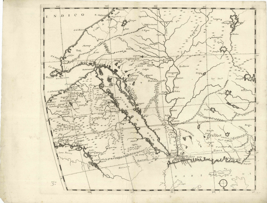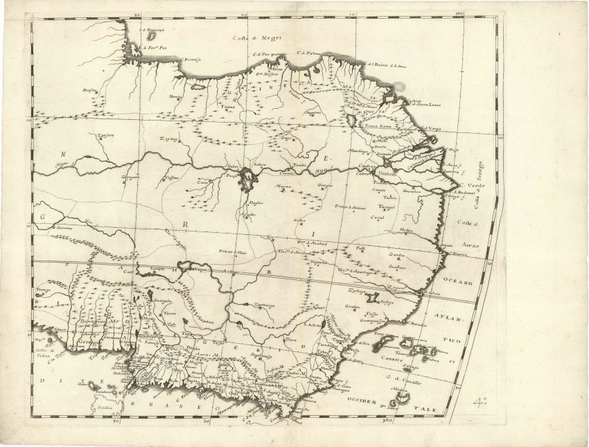 This map is the 1st state (four coastal place names off south-east coast south of 30°S) that was published in Dell' Hercole. The map is based on Sanson's 1650 map, but follows Ramusio and earlier Italian cartographers in that south is on top.The geographical information on the map is after Ptolemy, and somewhat conservative for the time in that few place names are provided. The lake in Abyssinia may be Lake Tana, the source of the Blue Nile.