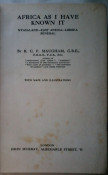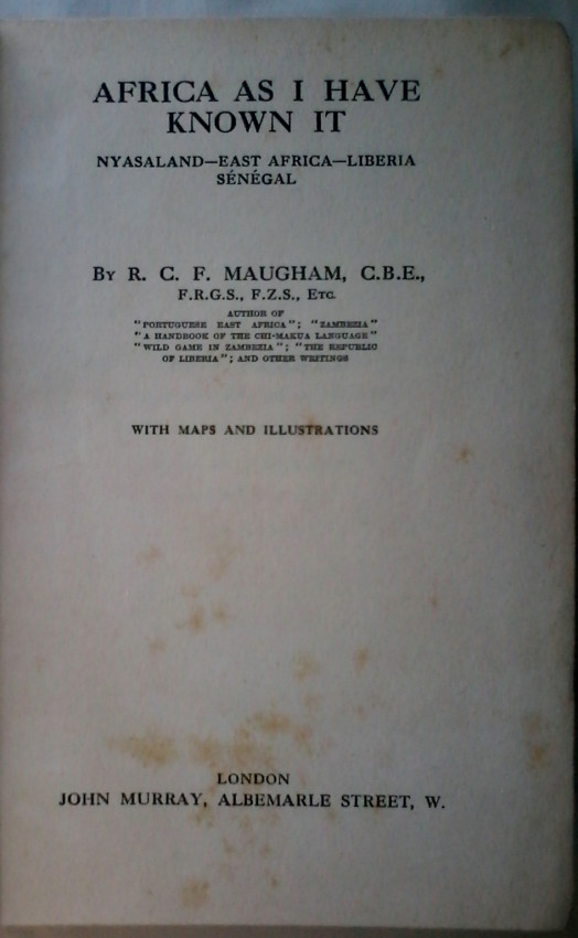 Africa As I Have Known It., Nyasaland-East Africa-Liberia-Senegal., By R. C. F. Maugham, C.B.E., F.R.G.S., F.Z.S., With Maps and illustrations., Published by John Murray., London., 1929. First Edition.