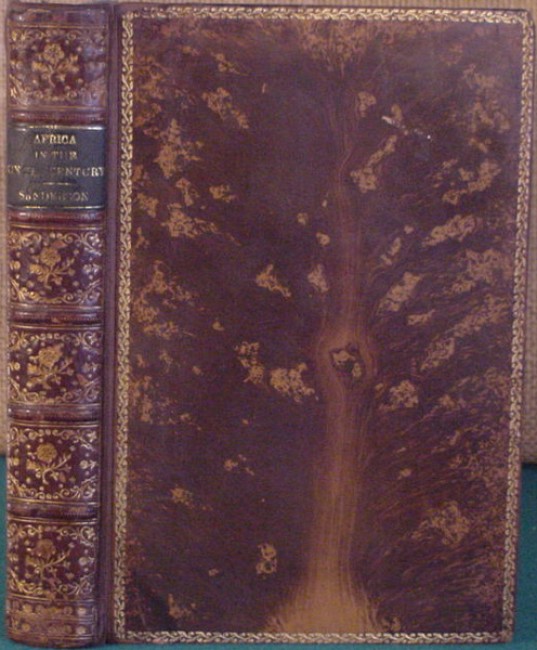 Beautifully bound in full tree-calf with gilt on spine and edge decoration on front and back covers. Textblock edge marbled as well as eps. The book gives an overview of the European explorations and conquests in Africa featuring the most prominent British imperialists. 335 pp with bw photographic plates and folding map. There is sporadic, light to middling foxing throughout, but otherwise in very good condition