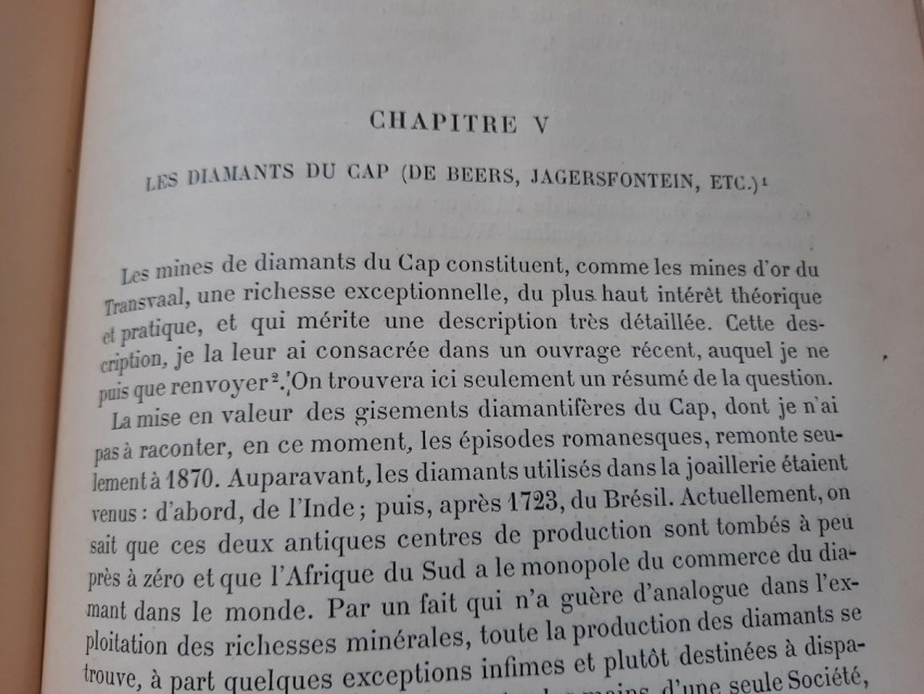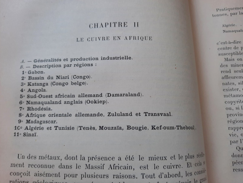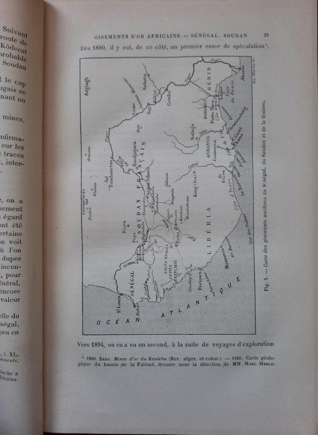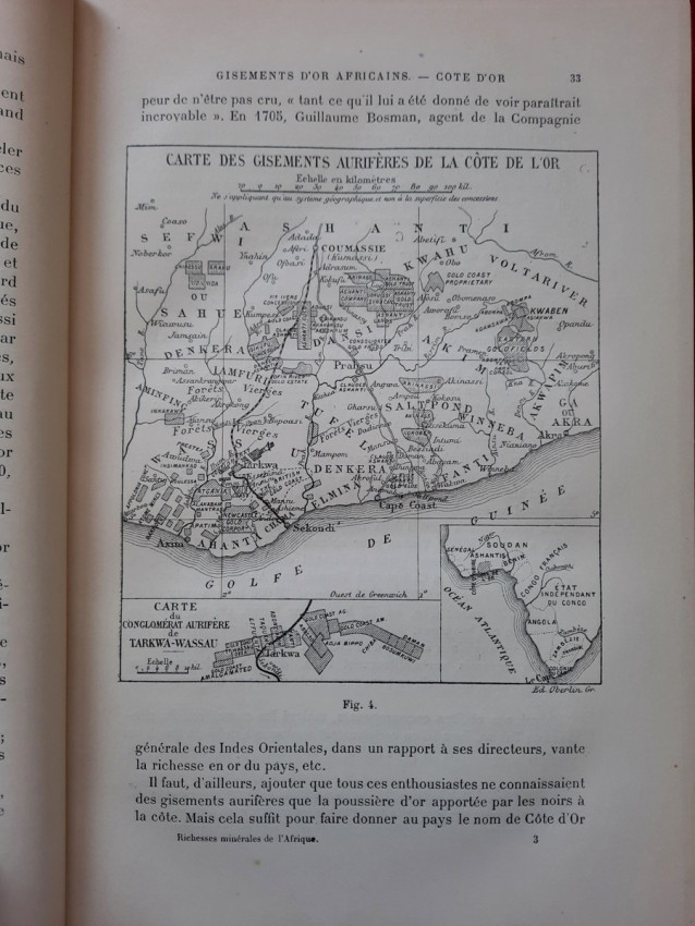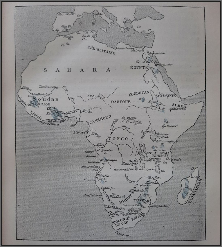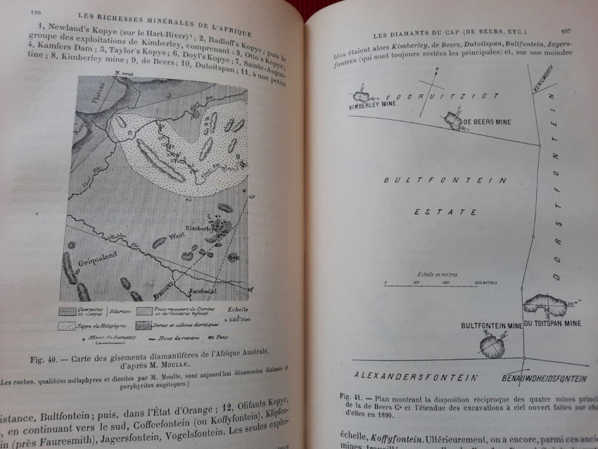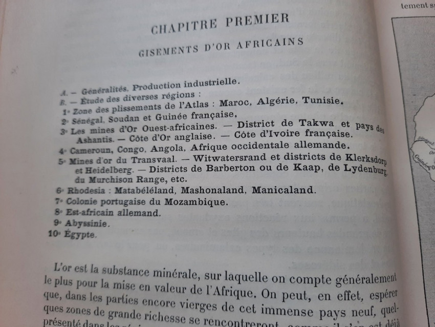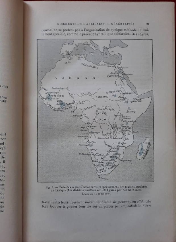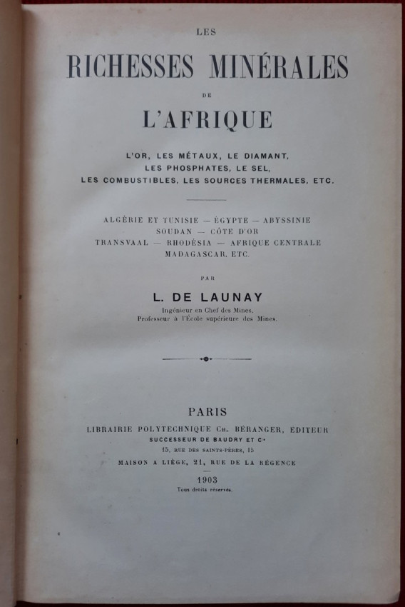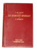 "Les Richesses Minerales De L'Afrique: L'Or, Les Metaux, Le Diamant, Les Phiosphates, Le Sel, Les Combustibles, Les Sources Thermales, Etc."; Original red cloth hardcovers; Text in French; Collation complete - Title page, (4), 416 pages; Binding is tight and firm, with some rubbing to the extremities and fading on covers and slight fraying on corners and spine ends. Pages/text block in impeccable condition, bright and clear, with slight yellowing, no foxing or any marks throughout. A clean copy in excellent condition.