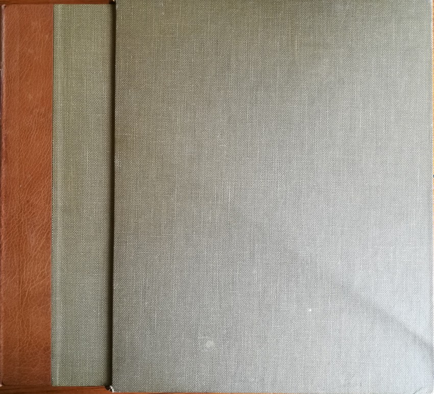 - Quarter-bound slipcase in tan calf with grey cloth-board sides