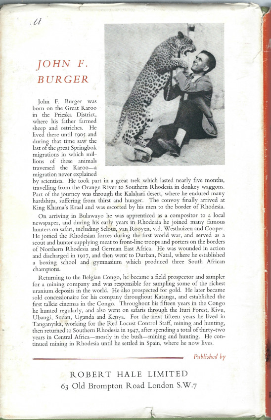 "An Afrikaner, Burger hunted throughout Central Africa, particularly for buffalo which he had become well acquainted with while serving as a meat hunter for troops in Africa during the Great War."