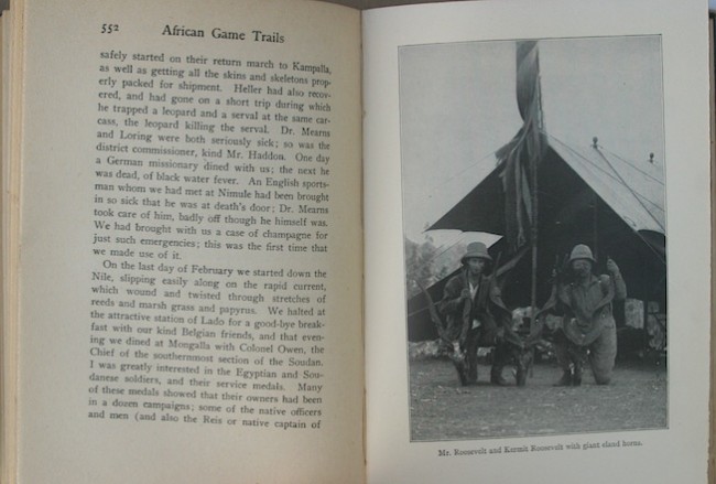 African Game Trails, an Account of the African Wanderings of an American Hunter Naturalist, by Theodore Roosevelt, former President of the USA. A hunting classic. This work was the result of Roosevelt's ten month hunting trip through Central and Northern Africa after leaving the White House in March, 1909 and relates the journey from Mombasa through the mountain regions of British East Africa, to Victoria Nyanza, through the Congo and Sudan to Khartoum and on to Cairo via the Nile.