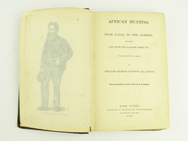 African Hunting notes, \'Baldwins greatest respect is reserved for fellow hunters. He records his acquaintance with Elephant White at that time known for his shooting exploits throughout Natal and, on his last journey to the Zambesi, his meeting with the far famed Afrikaners, John Viljoen and Piet Jacobs. They had had a glorious hunt (and) had killed ninety three elephants. Occasional references show that he is mindful of the achievements of his predecessor in the wilderness, Gorden Cumming.\'