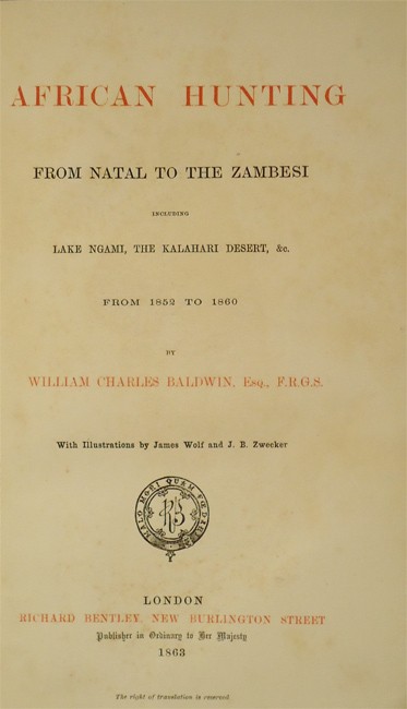 Dictionary of South African Bibliography, volume III, pages 42-3. ‘Baldwin arrived in Durban in 1851 having been attracted to South African by Cumming’s 'Five Years of a Hunter’s Life' published in 1850. He made several hunting expeditions to Zululand, Marico, Matabeleland and Lake Ngami. In April 1860 he again left for Potchefstroom intent on reaching the Victoria Falls, which he succeeded in doing more by luck than good management on August 3rd. He was the second white man to see the falls, the first to have reached them from the east coast (Natal), and the first to describe them with exactness and give their true dimensions, the accuracy of which he vouched for to David Livingstone himself, when the great explorer arrived about 8th or 9th August.’
