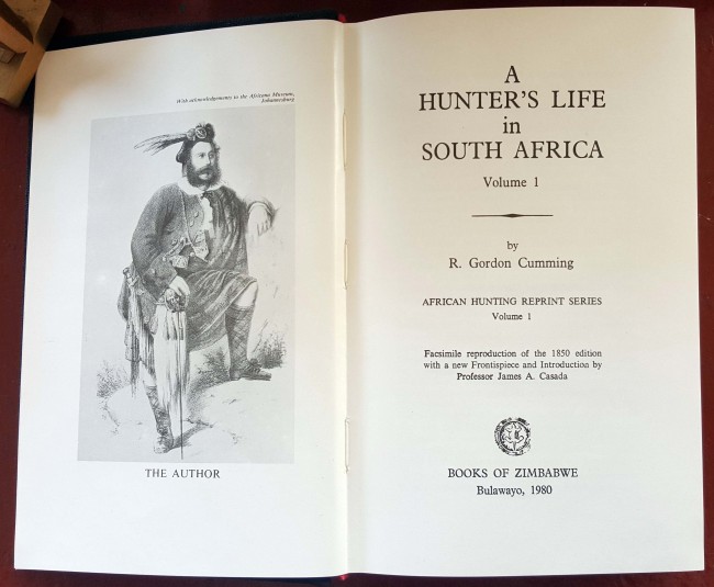 Vol 1 and Vol 2 - A Hunter's Life in South Africa by R.Gordon Cumming in two volumes. Facsimile reprint of the 1850 edition. xvii, xv, 388p and 381p. Illustrations and map.
