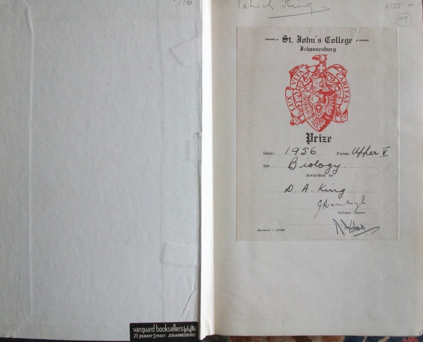 This copy was awarded by St John's College, Johannesburg, to D A King for Upper V biology in 1956. Patrick King's ownership signature is in pencil on the front free endpaper.