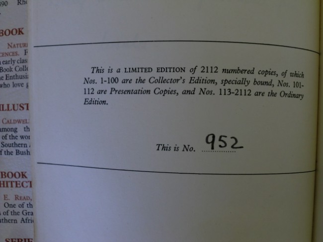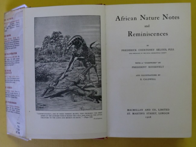 The Pioneer Head, Salisbury, Limited Edition facsimile copy of the original 1908 edition (this copy 952 of 1000 \'ordinary edition\'). Nine page Foreword by president Theodore Roosevelt, and a twenty chapters covering all subjects of nature and wildlife observation such as Marking, coloration and environment; notes on lions, spotted hyenas, wild dogs, cheetahs, Cape Buffaloes; Diminution of Game in South Africa, Tse-Tse fly, Black Rhinoceros, Giraffes; journey to Amatongaland; Hunting Experiences; etc...etc...with b/w photographs and sketches accompanying the text. Book condition: good binding and endpapers, internally clean, tight and unmarked (owner inscription on verso of f.f.e.p.), front edge uncut, a few small areas of insect damage to front board (surface, not deep). Jacket: Fair to Good; heavily browned, spine ends with loss, front panel with patches of loss due to insect activity, unclipped.