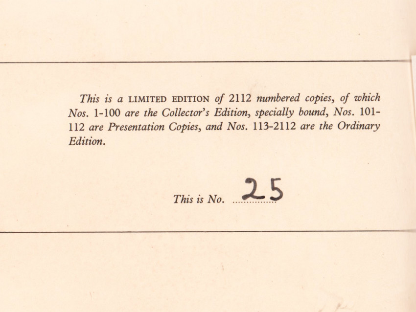 Limitation reads: This is a limited edition of 2112 numbered copies, of which nos. 1 – 100 are the Collector’ s Edition, specially bound, nos. 101 -112 are presentation copies, and nos. 113 -2112 are the ordinary edition. This is no.25