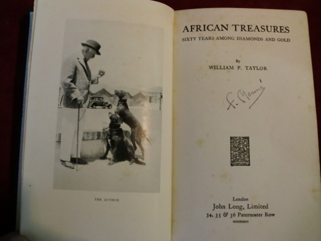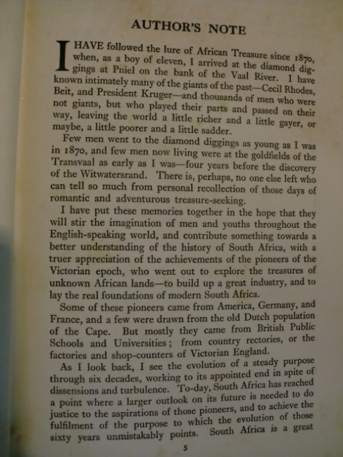 A very good copy of this scarce title on the early diamond and gold discoveries in places such as Kimberley, Wesselton, Koffiefontein, Lichtenburg, Alexander Bay, Pilgrim's Rest, Barberton, The Rand, The Robinson Mile, Modderfontein. Also a chapter on Platinum, asbestos and copper, another on Types of Treasure Seekers, The Natives, and finally The Boer In The Background, Boer and Uitlander, etc... black and white photos and illustrations are included, the dark blue boards are in excellent condition (gilt spine title), owner dedication on f.f.e-p., small portrait sticker affixed to half-title, patches of light foxing throughout, 288pp.
