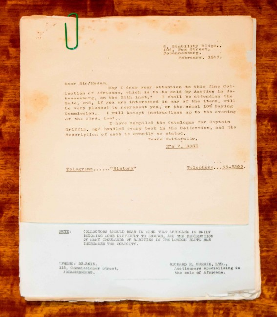 (1) 24 February 1943. "Captain A J Griffin's magnificent Africana collection" including approximately 500 books by Isaacs, Kolben, Burchell (the 2-vol set in original binding), Latrobe, Campbell and Harris (both with coloured plates). Page 1 includes the note: "Collectors should bear in mind that Africana is daily becoming more difficult to secure, and the destruction of many thousands of rarities in the London Blitz has increased the scarcity." - Richard R Currie, The Old Mart, Commissioner Street, Johannesburg. ii + 35 mimeographed pages describing 475 lots. The list comes under cover of a letter from Eva V Rose, of Fox Street, Johannesburg, who compiled the catalogue "and handled every book in the collection". She was prepared to act for buyers "on the usual 10% buying commission".