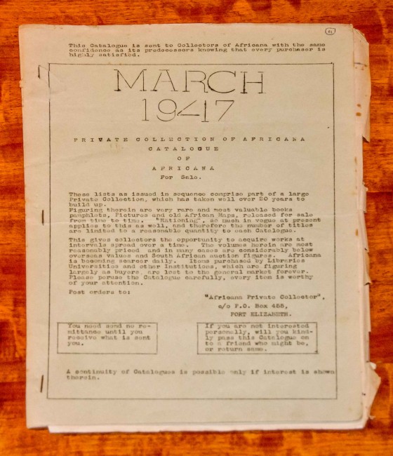 (3) March 1947. A priced catalogue of a large private collection of Africana collected over more than 20 years from "Africana Private Collector" c/o P O Box 455 Port Elizabeth. 23 pp + 1 p addendum (p 18 missing). This copy was returned to the sender with a one-penny stamp. No money was required until the wanted item was delivered. High-priced items included 27 pounds 10 shillings for a Roupell; 24 pounds 10 shillings for a Golden Cockerel edition of Sparrman, "finished on 27 October 1944 on mould-made paper", No 6 of 50 specially bound copies in white pigskin, gilt, in cloth case; and 19 pounds ten shillings for a Fairbridge; and the same for a first edition of Olive Schreiner's "Story of An African Farm" (Ralph Irons, 2 vols, 1883, "original decorated cloth, good state").