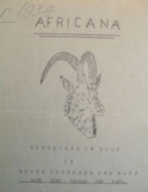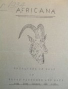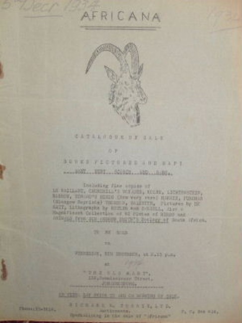 A cyclostyled catalogue in the original printer wrappers for a sale on 5th December, 1934. Containing interesting books, maps & pictures. Books included Kolbe (Dutch) 1727, Harris \"Highlands of Ethiopia\" & \"Wild sports.\" Prints included some from Harris\' \"Portraits,\" Bowler\'s view of Cape Town and two original water colours by A. de Smidt. Altogether 243 lots with prices neatly entered in pencil. Some browning, recently re-stapled
