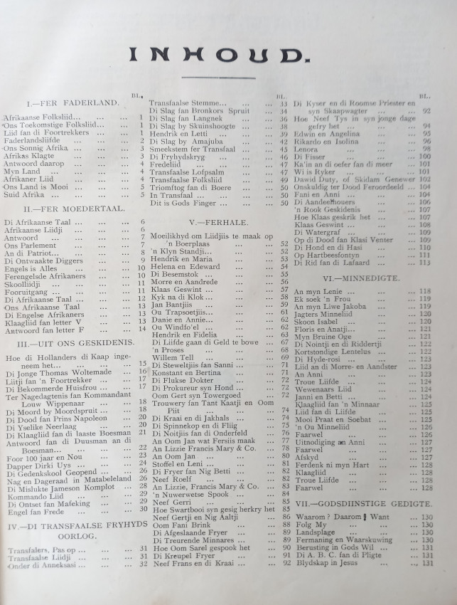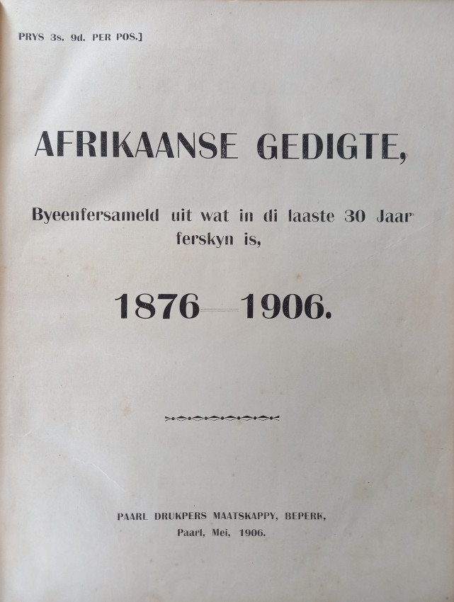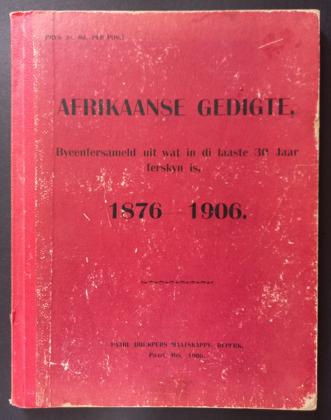 "Byeenversameld uit wat in di laaste 30 Jaar ferskyn is" Fascinating early poems gathered from various publications of the time. Includes patriotic songs and poems in chapters such as "Fer Moedertaal" and "Fer Faderland". Also "Di Transvaalse Fryheidsoorlog" and "Minnegedigte (love poems).