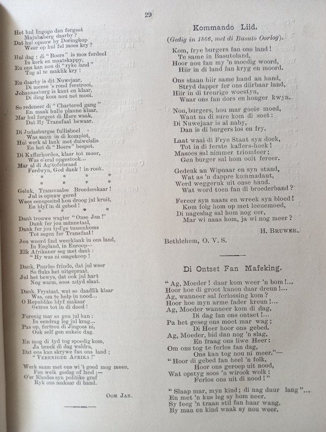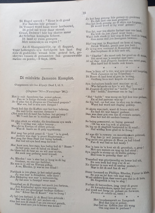 Many poems about the Anglo-Boer War such as "Di Mislukte Jameson Komplot" on page 28 (which first appeared in Ons Klyntji) "het jy ooit fanselewe fan gehoor, fan so 'n listige duiwelskomplot?" There is also an example of an early poem ("Kommando Liid") dating from 1866.