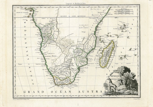 An unusual feature of this map is the name words “Madecasse ou (or) Madagascar” (the former was excluded from the fist, 1809, edition of the map; today Madécasse has disappeared from us but is remembered in the brand of chocolate made in Madagascar. Marco Polo named the island Madageiscar and Diogo Dias, a Portuguese explorer, named it São Lourenço after discovering the island on the day of the Saint.