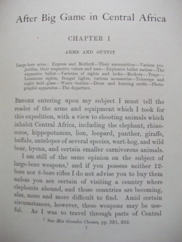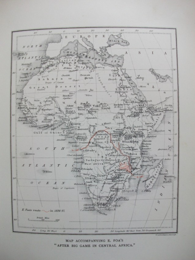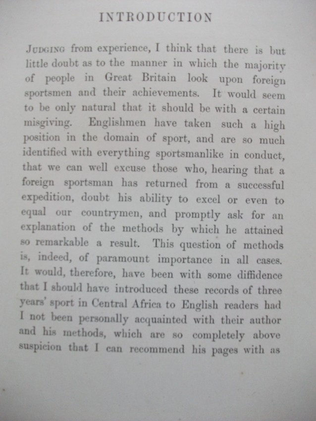 Frederic Lees's introduction begins with the comment that British sportsmen doubt the ability of their foreign colleagues to equal their own feats or, indeed, to excel; but that this author had been so successful as a hunter and scientific researcher that three European geographical societies had awarded him medals, while the King of Brussels had decorated him. The introduction also outlines the course of his exploration and hunting route, marked in red on the map.