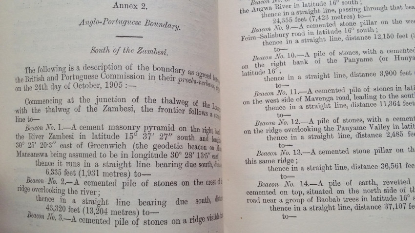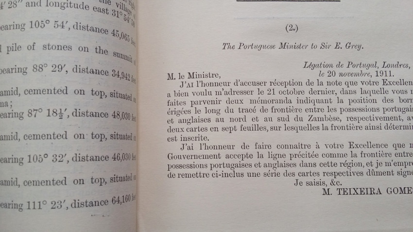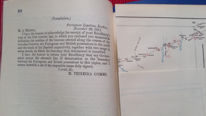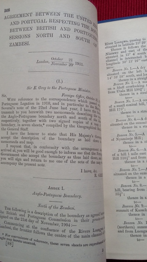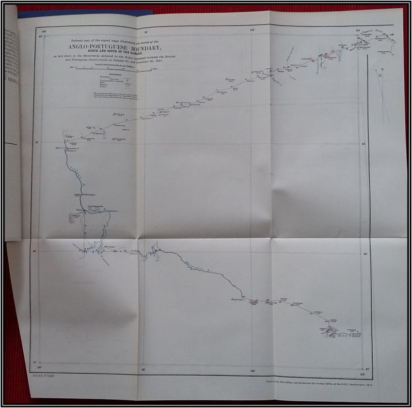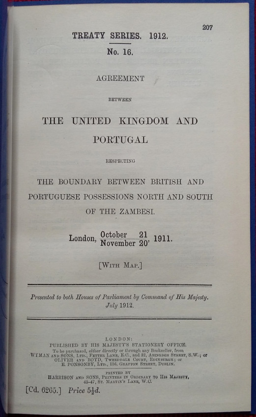 "Agreement between The United Kingdom and Portugal respecting The Boundary between British and Portuguese possessions North and South of the Zambesi. London, October 21, and November 20, 1911. [WITH MAP.]"; British Parliamentary Paper [Cd.6265.]; Rebound in card covers; Collation complete - 10 pages, with folding map (41 x 38,5 cm); Text in English and Portuguese; A clean copy, no marks of foxing throughout.