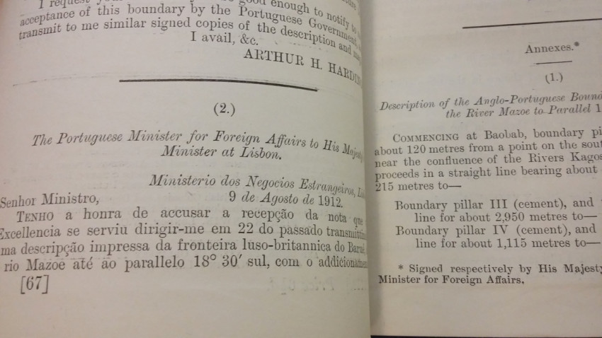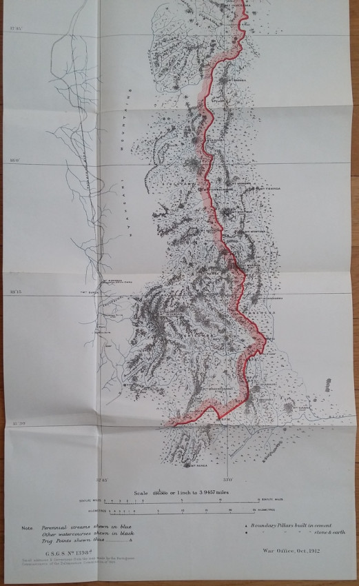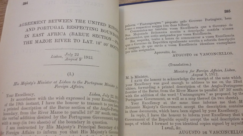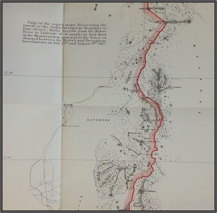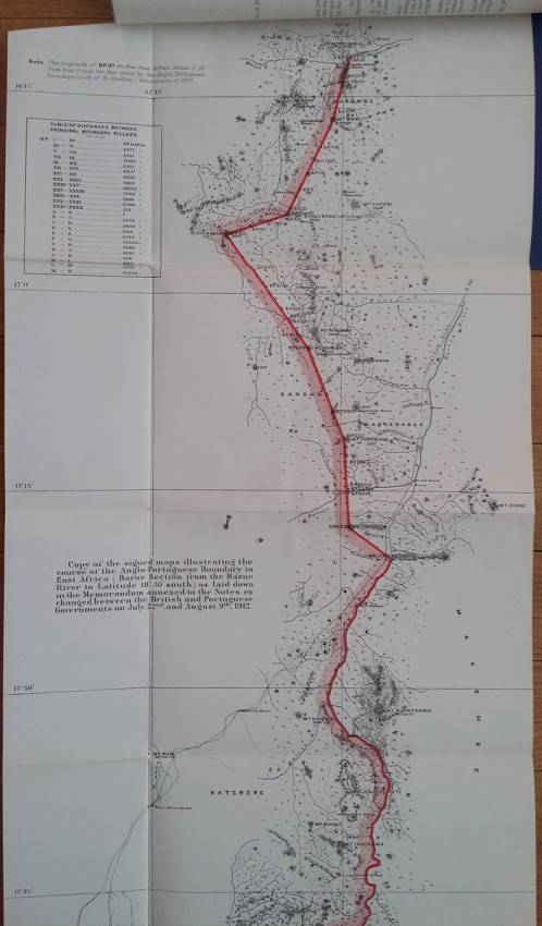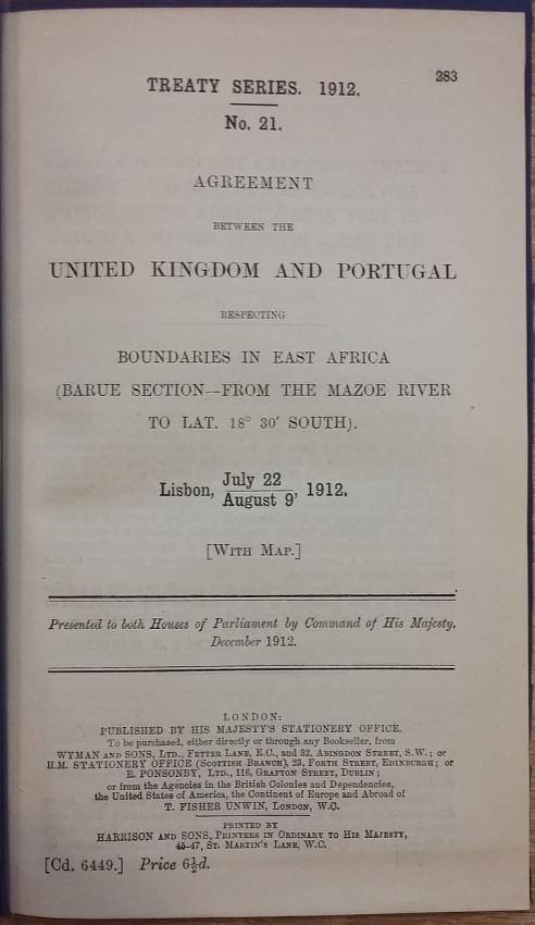1) "Agreement between The United Kingdom and Portugal respecting Boundaries in East Africa (Barue Section - from the Mazoe River to Lat. 18°30' South). Lisbon, July 22, and August 9, 1912. [WITH MAP.]"; London, His Majesty's Stationery Office, 1912; British Parliamentary Paper [Cd.6449.]; Rebound in card covers; 23,5 x 14,5 cm; Collation complete - 5 pages, with colored folding map (94 x 29 cm); Text in English and Portuguese; A clean copy, no marks of foxing throughout; Boundary between Mozambique & Zimbabwe agreed. With large colored folding map (94 x 29 cm) illustrating the course of the Anglo-Portuguese Boundary in East Africa (drawn at the War Office - Southampton, October 1912). This is the only copy of this item selling on internet!