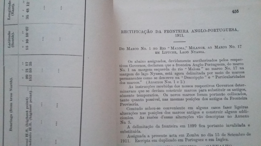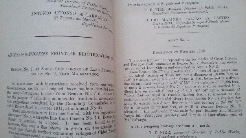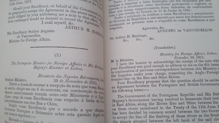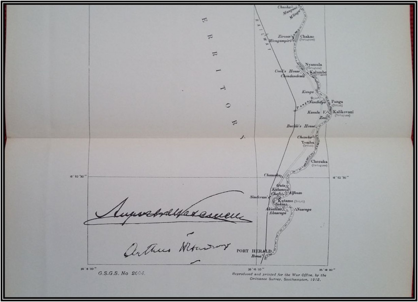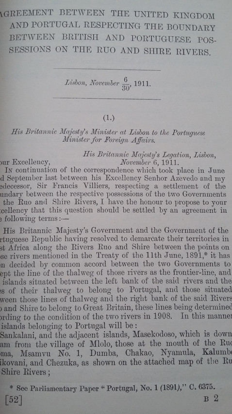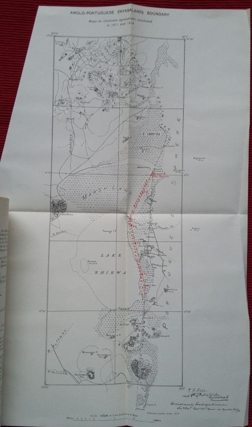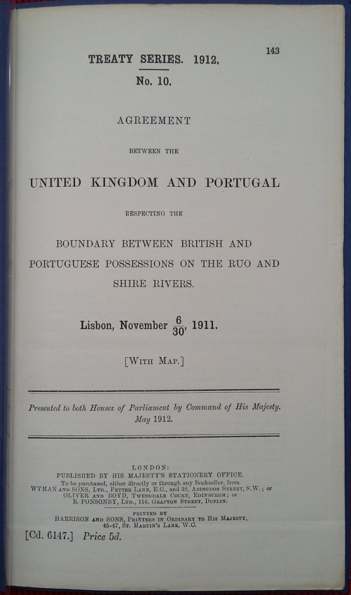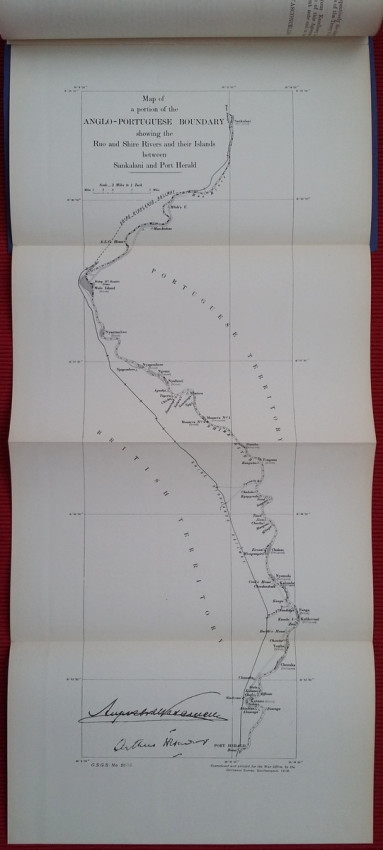 2) "Agreement between The United Kingdom and Portugal respecting The Boundary between British and Portuguese possessions on the Ruo and Shire rivers. Lisbon, November 6, and November 30, 1911. [WITH MAP.]"; London, His Majesty's Stationery Office, 1912; British Parliamentary Paper [Cd.6147.]; 24,5 x 15,5 cm; Rebound in card covers; Collation complete - 4 pages, with folding map (54 x 24 cm); Text in English and Portuguese; A clean copy, no marks of foxing throughout; Boundary between Mozambique & Malawi agreed. With folding map (54 x 24 cm) of a portion of the Anglo-Portuguese Boundary showing the Ruo and Shire Rivers and their Islands between Sankalani and Port Herald (drawn at the War Office - Southampton, 1912). This is the only copy of this item selling on internet!