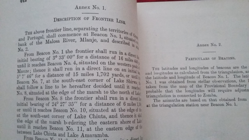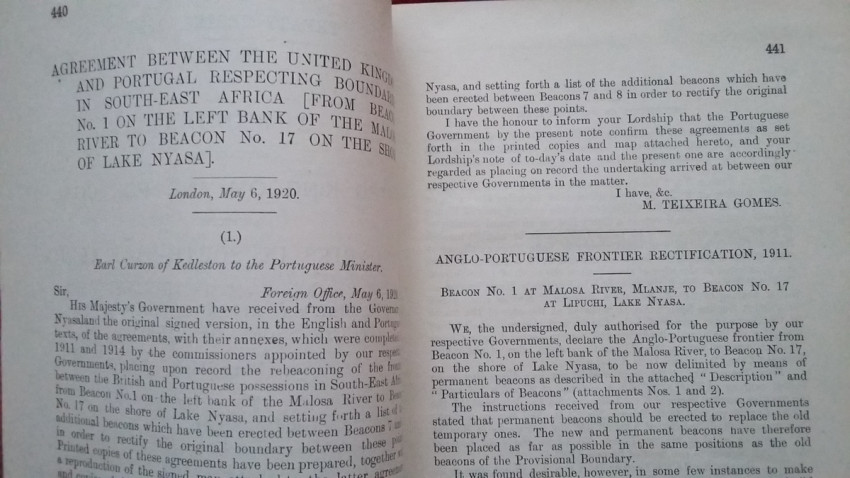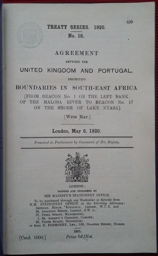 3) "Agreeement between the United Kingdom and Portugal, respecting (from Beacon No.1 on the left bank of the Molosa River to Beacon No.17 on the shore of Lake Nyasa. [With Map.]. London, May 6, 1920."; London, His Majesty's Stationery Office, 1920; British Parliamentary Paper [Cmd. 1000]; Rebound in card covers; 24 x 14,5 cm; Collation complete - 25 pages, with folding map (27,5 x 44 cm); Ex-libris stamp to the title page. A clean copy, no marks of foxing throughout; With folding map (27,5 x 44 cm). This is the only copy of this item selling on internet!