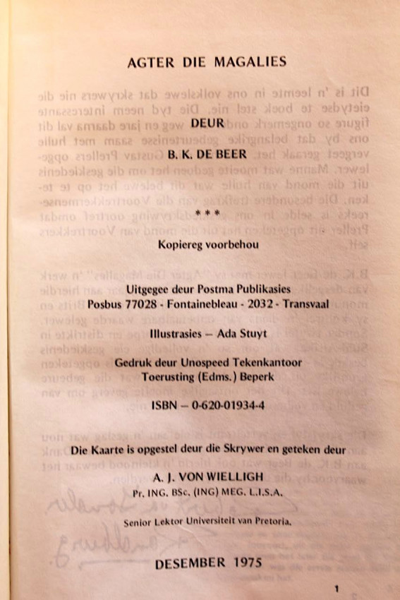 A very uncommon and sought after title which deals with the history of the area north of the Magaliesberg mountains, which today roughly comprises the towns of Rustenburg and Brits in South Africa's North West Province. The region is well-known for its citrus production and platinum mines. In the past it formed part of the domain of Silkaats (Mzilikazi "Path of Blood"), a former general of Zulu king Shaka and the first king of the Ndebele, who, due to his own bloodthirstiness, was driven from the territory by the Voortrekkers.
