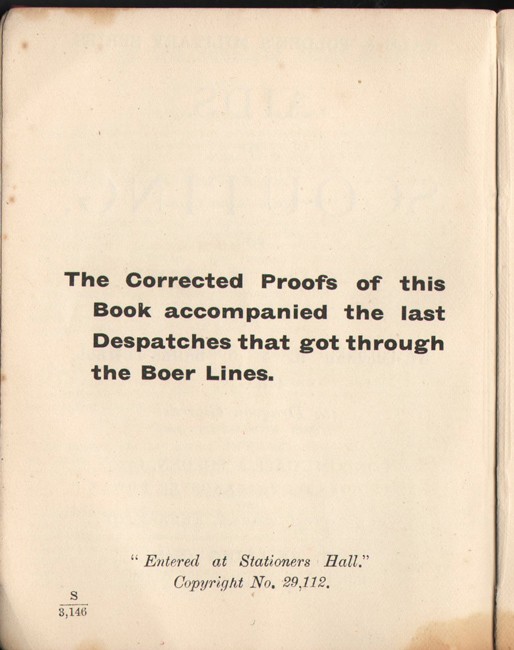 By the time the book was eventually published, the Boer War and the Siege of Mafeking had started, in fact the very first shots of the conflict were fired just outside Mafeking. The preface page of the small breast-pocket sized red book bears the melodramatic statement - The Corrected Proofs of this Book accompanied the last Despatches that got through the Boer lines.
