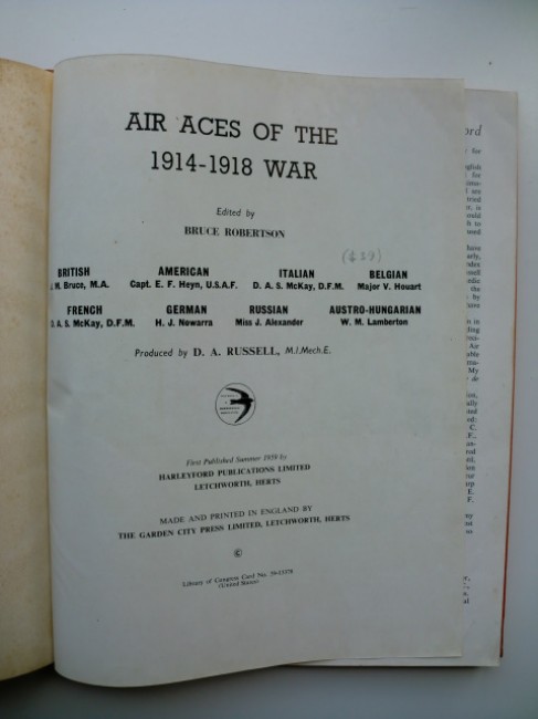 A record of the pilots and planes of World War One era, 212pp., with many black and white photographs, plus lists of officers who fought for the various countries, including Germany, Britain, France, Italy, America, medal lists, etc..