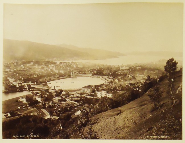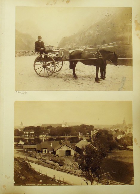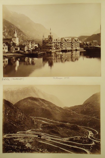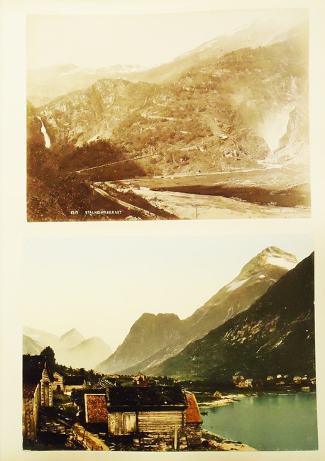 136 images – 17 coloured (1 loose) – about half are by Knudsen. The photographs are of various locations including Stavanger,Ryfylke, Hardanger, Vossevangen, Bergen, Gudvangen, Romsdal, Trondheim, Hammerfest and others.