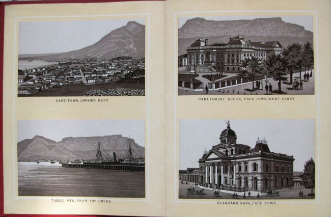 Cape Town, Looking East, Table Mountain from the Docks. Parliament House, Cape Town, West Front. Standard Bank, Cape Town. Dutch Reformed Church, Cape Town. Plein Street, Cape Town. Adderley Street, Cape Town. Greenmarket Square, Cape Town. Parade, Cape Town. Fishmarket, Cape Town. The Devil's Peak & Mowbray. Houts Bay. Botanic Gardens, Malay's New Year. Government Farm, Constantia. Simon's Town. Central Jetty, Port Elizabeth. Central Jetty. Part of Main Street, Port Elizabeth. Main Street, Port Elizabeth. Post Office & Jetty Street, Port Elizabeth. View from Donkin Reserve, Port Elizabeth. Post Office, Kimberley. Market Buildings & Govt. Buildings, Kimberley. Market Square with Bullock Wagons, Kimberley. Wood Wagons on Market, Kimberley. Bullfontein Mine Kafirs at Work. Du Toits Pan Mine, Griqualand West. Hauling Machine for drawing up the ground from the mine. Washing Gear. Mule Coach off to Gold Fields. Hauling Gear Old Style. Salesbury Whim. Pitt Head Gear. Pitt Head Gear, Langelaggete.Main Reef Knights. Shaft on Reef, Knights co. Gold Workings, Knights. Knights Battery House. Roodepoort Central G.M.co. Gold Crushing Battery, Roodepoort. Theatre Royal of Johannesburg. Government Buildings. Fire Station. First Exchange, Commissioner's Street. Pretoria. Matabele Warriors. S. Africa. Malay Woman, Cape Town. Malay Woman, Cape Town. Malay, Cape Town, Malay, Cape Town. Malay Fruit Seller, Cape Town. Zulu Woman. King Ceteways. Zulu Women. Native Fighting. Zulus Eating Breakfast Porridge. Zulus. Zulu. Bushwoman's Children S.Africa. Zulus.