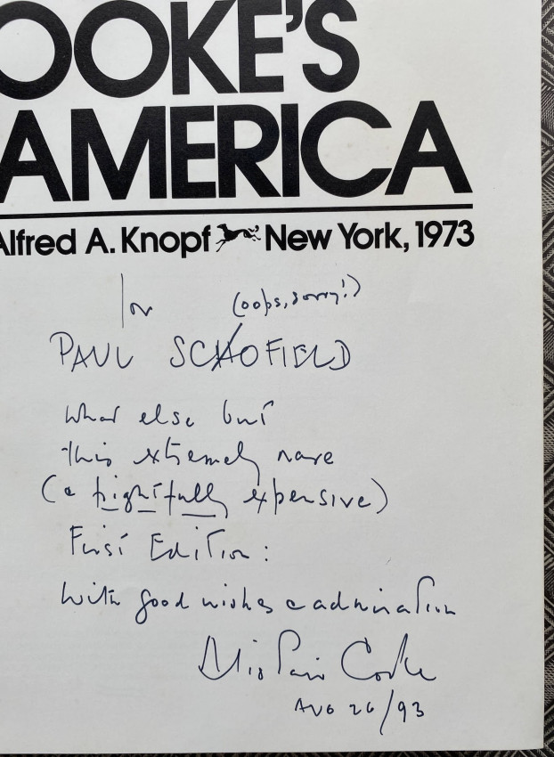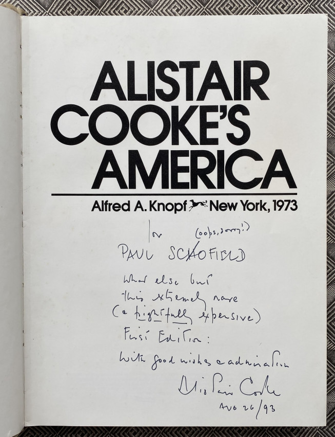Provenance: Paul Scofield (inscribed "for / Paul Schofield [the 'h' crossed through with added aside:] / (oops, sorry!) / What else but / this extremely rare / (& frightfully expensive) / First Edition: / With good wishes & admiration / Alastair Cooke / Aug 26 [19]93", in addition Cooke has highlighted the words 'First Edition' on the verso of the title).