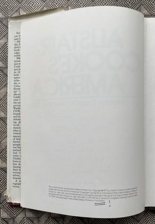 Alistair Cooke's America. New York: Alfred A. Knopf, 1973. Large quarto (10 7/8 x 8in; 277 x 203mm). Pp. [1-]7-400. Illustrations, many colored. Original cloth, dust-jacket (extremities a bit bumped, stain to front free endpaper, small tears and nicks to dust-jacket.