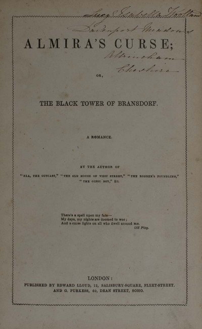 Book Description: Almira’s Curse; or The Black Tower of Bransdorf is a mystery fiction novel.