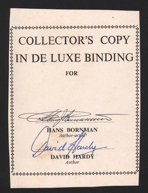 Loosely inserted is slip saying, ‘Collector’s Copy in De Luxe binding for….’ but no subscriber’s name is shown. The slip is signed by the authors. As far as we know no De Luxe edition was produced for this book.