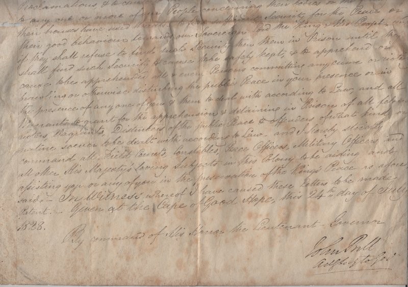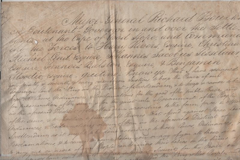 Richard Bourke was the Lieutenant-Governor of the Eastern District of the Cape of Good Hope, acting as Governor for both the eastern and western districts from 1826 to 1828. Bourke appointed Benjamin Moodie and others as Justices of the Peace in the Swellendam district. Under Bourke's Governorship much was done to reform the old mercantilist system of government inherited from the Dutch East India Company at the Cape. This document, in stylistic legalese, clearly lays out the duties expected of them.
