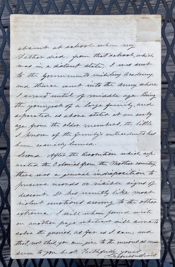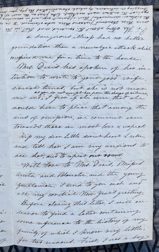 Jefferson DAVIS (1808-1889). Autograph letter signed, to ‘Dr. M.[aurice] Davis, / My dear friend, Memphis, Tenn., 6th Jany 1875. Octavo (8 x 5 in; 203 x 127mm), 4pp. ‘Your very welcome letter has been received… No one has ventured on ‘faint praise’ of you and your beloved family, to me, and if they had, it would have been inconsistent with manly gratitude to have listened to it. Thanks for considering my silence long, and to excuse it, can only say that there has been nothing concerning myself that it would have been pleasant for you to hear, or for me to relate. Of public affairs in our own section, there has been little which might not belong to the reign of King John, before the memorable event at Runnymede. So you have been the gainer by my silence, & as far as concerns public affairs, it shall be preserved, but to the personal questions it is due to you that I answer.' He goes on to describe his wife Varina’s ill-health, notes that 'The children are well. Maggie is in society. Jeff at the Military School in Virginia. Little Minnie goes to day school' He goes on to ask that the Dr. ‘Kiss my dear little sweetheart Lulu [?Ella, 1863-1932], and tell her I am very anxious to see her, and to repeat our vows. With love to Mrs. [Esther] Davis [1821-1898], Misses Anita [b.1855] and Blanche [b.1856], and the young gentleman, I send to you each and all my cordial New Year’s greeting.’ The personal questions he mentioned concern his family origins and he goes on to explain that because his father died when he was young and because there was no great desire (as a new Nation) to explore links with the old country, he knows little of his family in the UK.