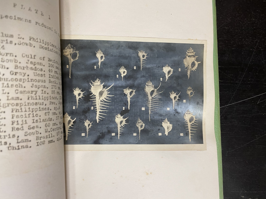 - Smith, Maxwell. A catalog of the recent species of the family MURICIDAE. Part one. Lantana, Florida: tropical laboratory, 1938. Stapled green paper covers with lettering along spine, containing mimeographed pages of text and 10 photo illustrations, “ mostly from specimens in the writers collection“. Author was a noted amateur conchologist; Author & publisher of: East Coast Marine Shells, 1937; Catalog of Rock Shells; World Wide Sea Shells; Review of the Volutidae; Tritons, Harps and Helmets; Universal Shells, and others. Smith received an Honorary D Sci degree from Univ Alabama in exchange for his collection. (See Conchology.com) Rare. Some photos coming loose.