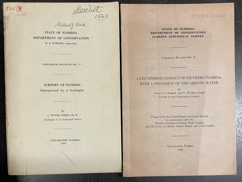 - Cooke, C. Wythe. Scenery of Florida Interpreted by a Geologist. Tallahassee: Pub. for the State Geological survey, 1939. Printed wraps, 118 pages illustrations, 23 cm. Ownership markings on cover.