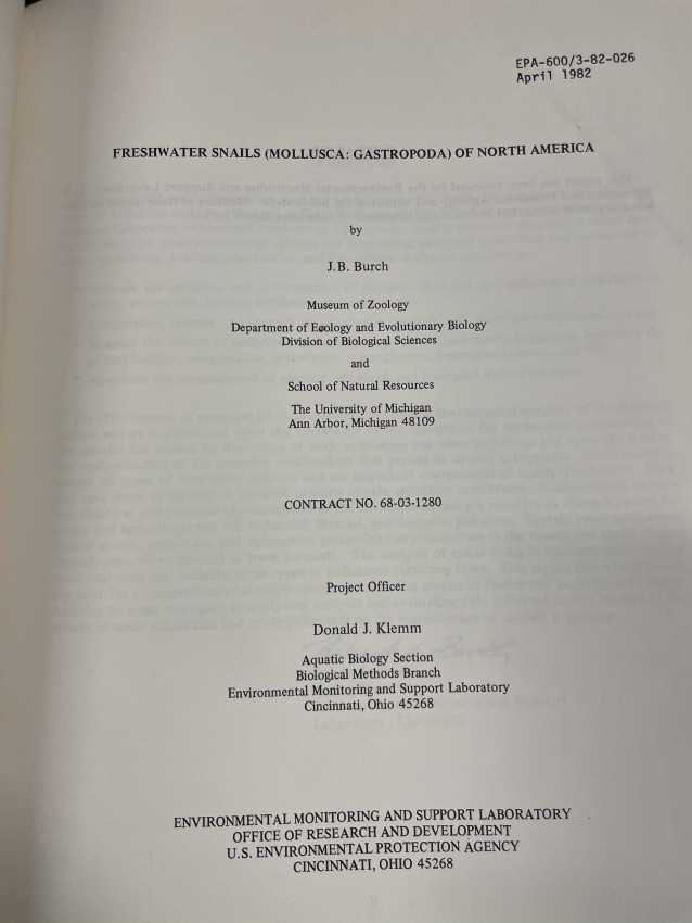 - Burch, J. B. Freshwater snails (Mollusca: Gastropoda) of North America. Cincinnati: E.P.A., (1982); 294 pp., illustrated , rebound in cloth with printed wrapper retained.