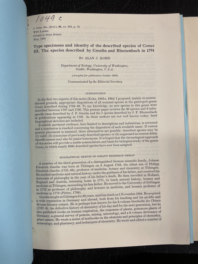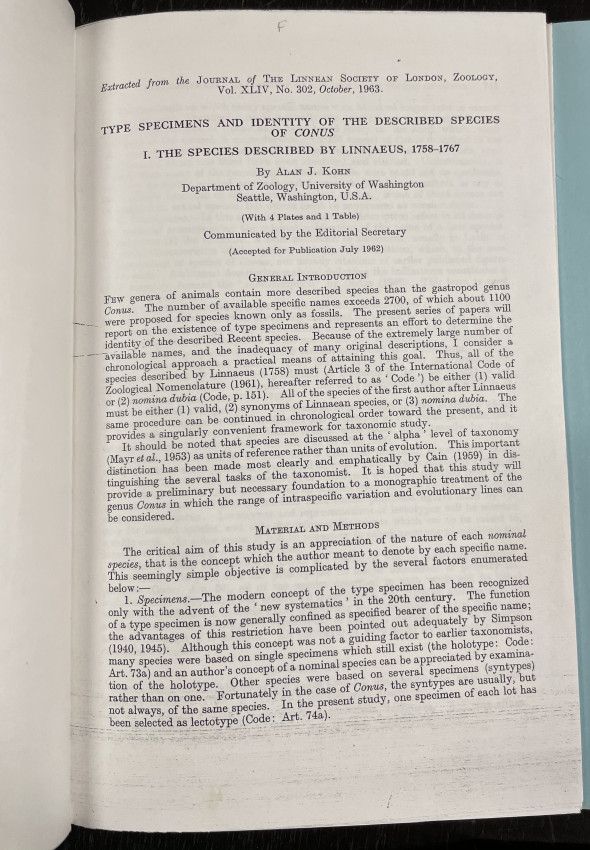 - John, Alan J. Types of Konus. Bound volume containing original and photocopied issues of Kohn’s extended series, Typed specimens and identity of the described species of Conus, 1963-1988. Bound in green cloth.