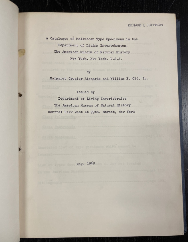 - Richards, Margaret Crozier, and William E Old, Jr. A catalog of molluscum type specimens in the department of living invertebrates, ...American Museum of natural history, May 1969. Mimeographed copy bound in blue cloth. 147 pp., Printed on one side only.