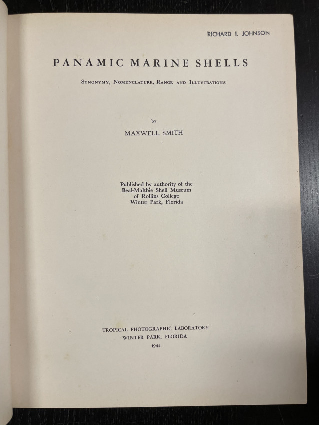 - — —. Panamic Marine Shells. Winter Park, Fla: Tropical photographic laboratory, 1944. Book xiii, 127 pages including plates 28 x 22 cm.; rebound in cloth. Full title: synonymy, nomenclature, range and illustrations by Maxwell Smith; published by authority of the Beal-Maltbie shell museum of Rollins college, Winter Park, Florida.