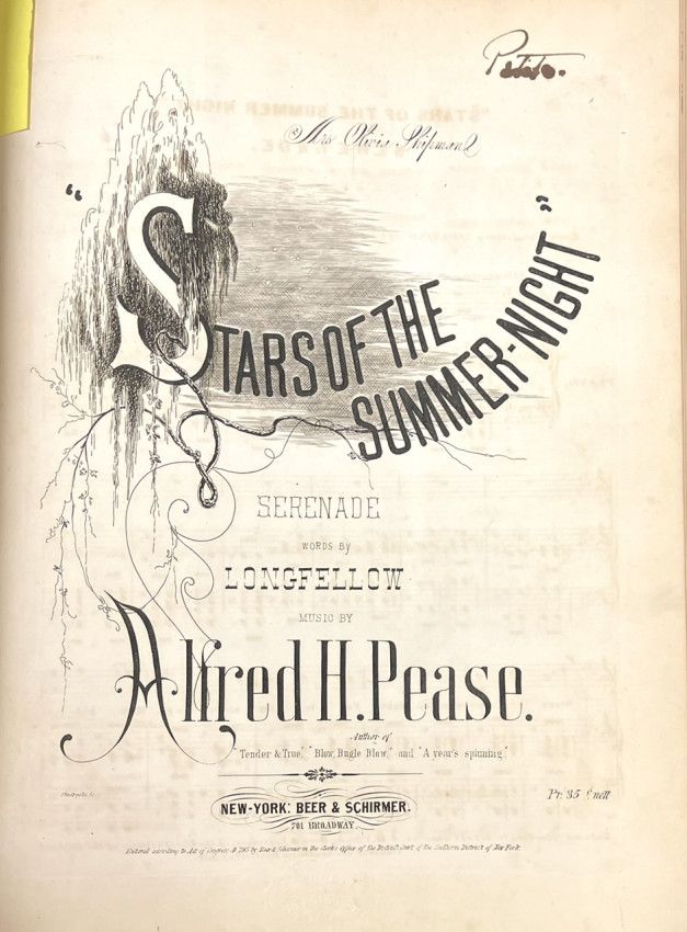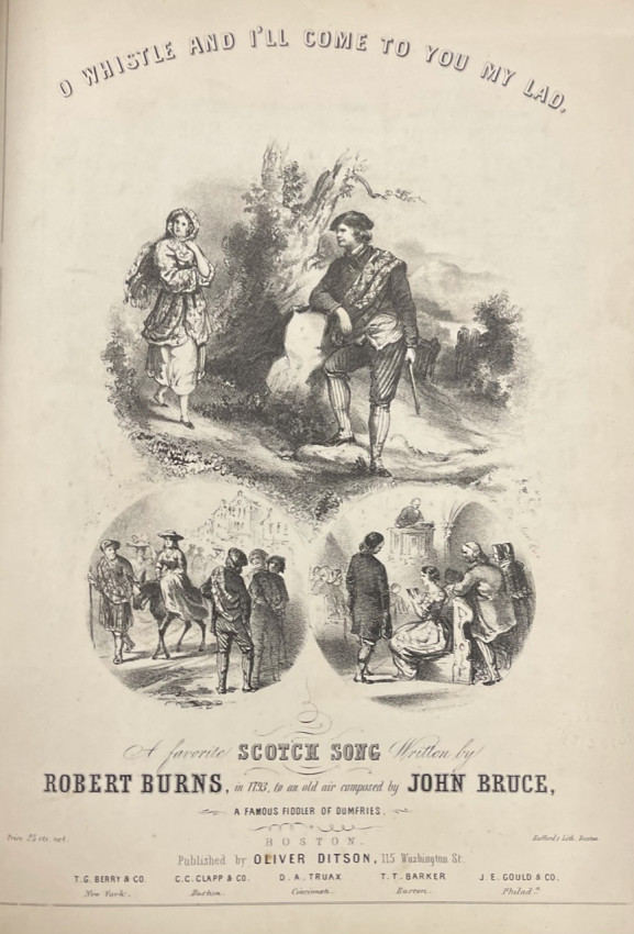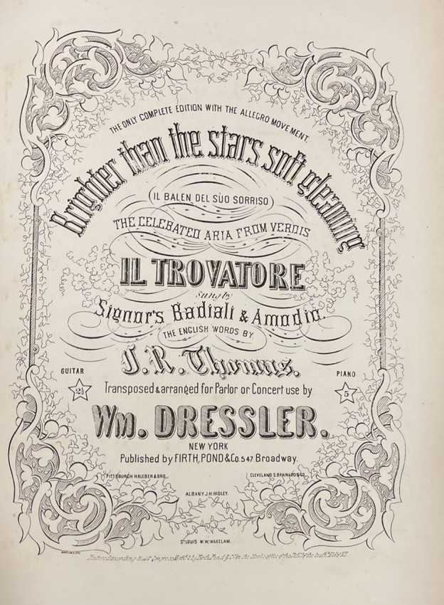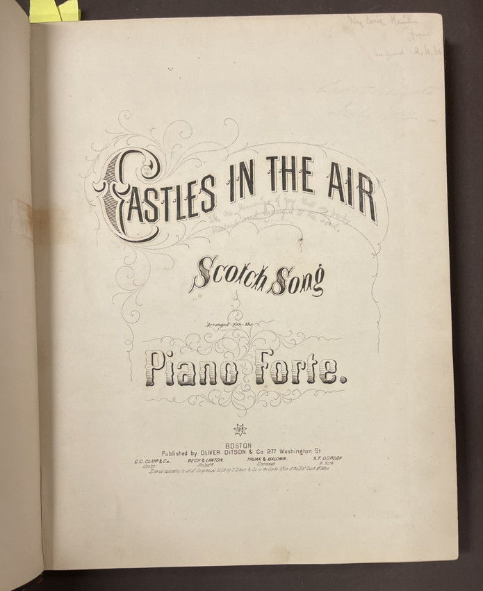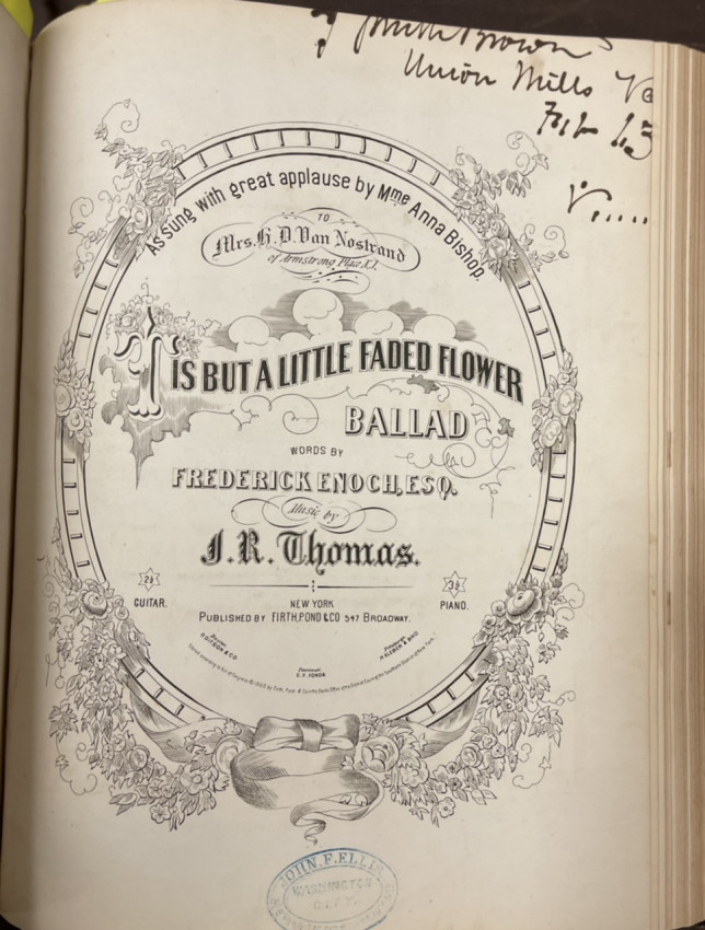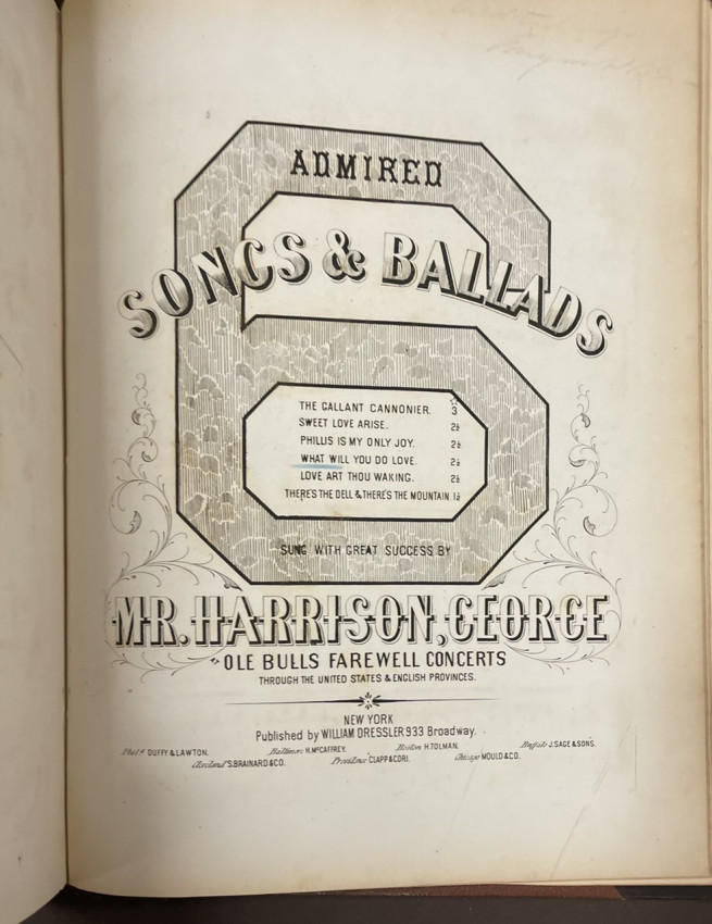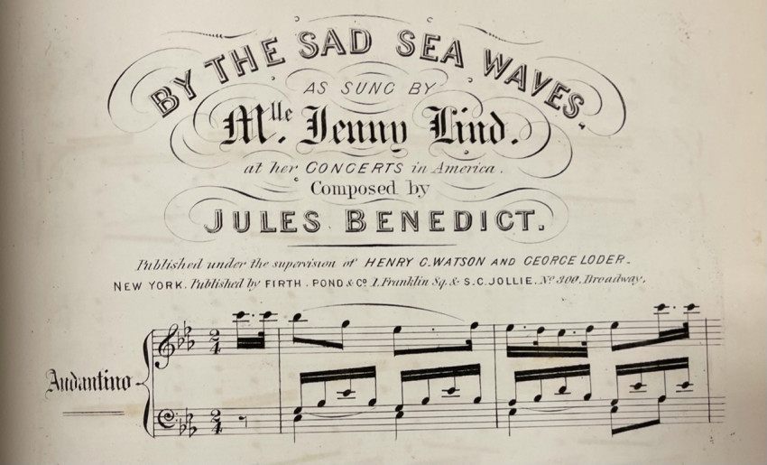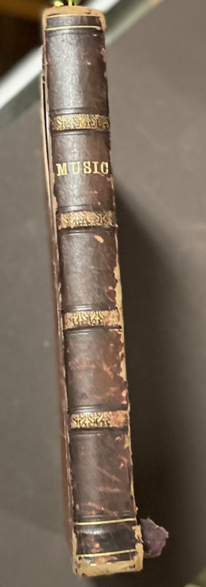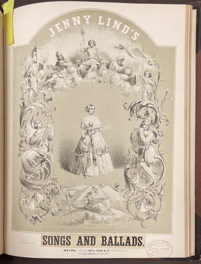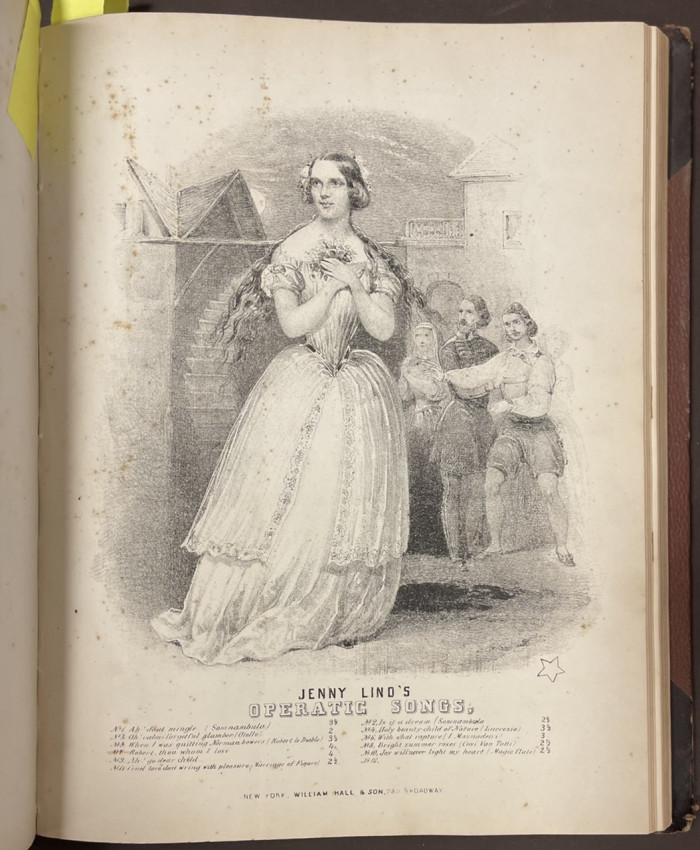 Bound volume of varied American sheet music, mid 19th century, including a few songs featuring Jenny Lind. Leather spine, edges and corners rubbed, chipped.