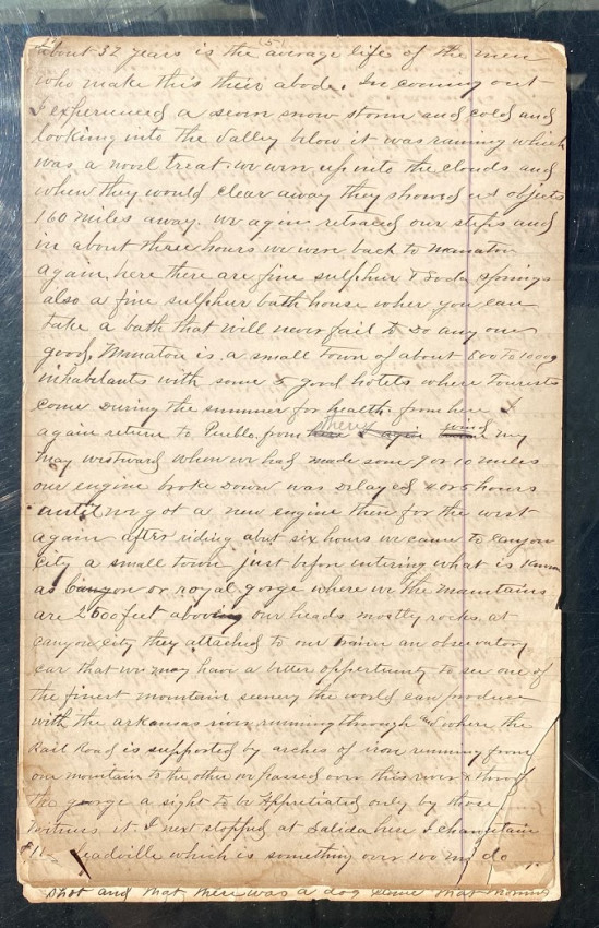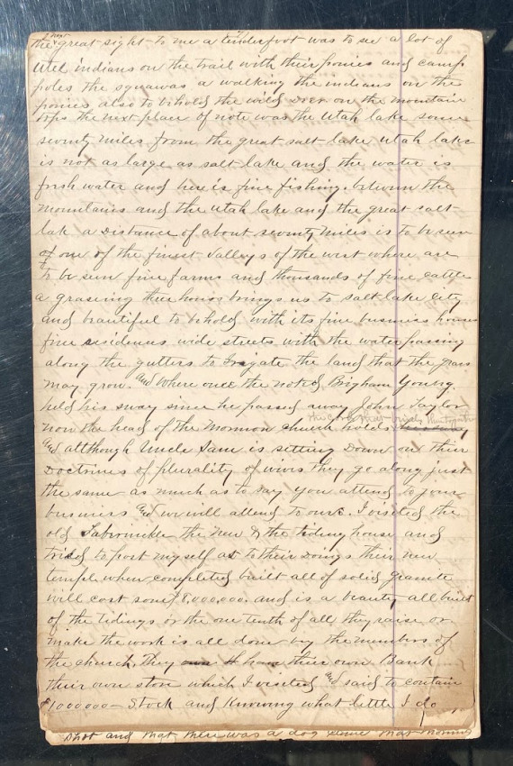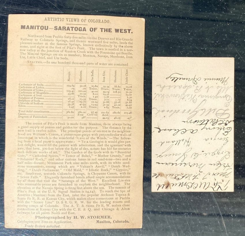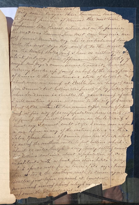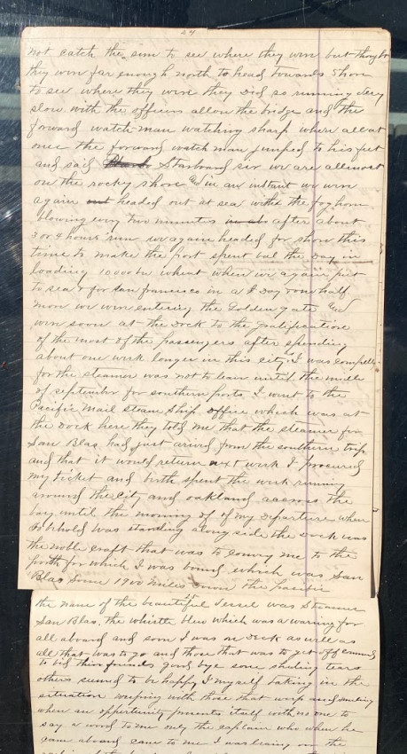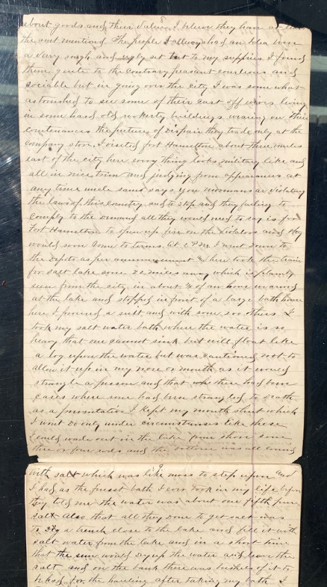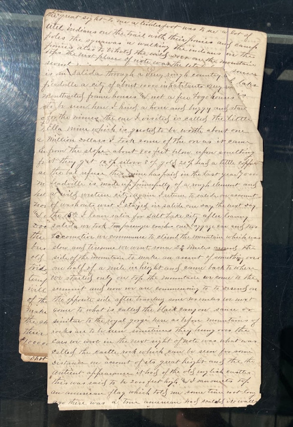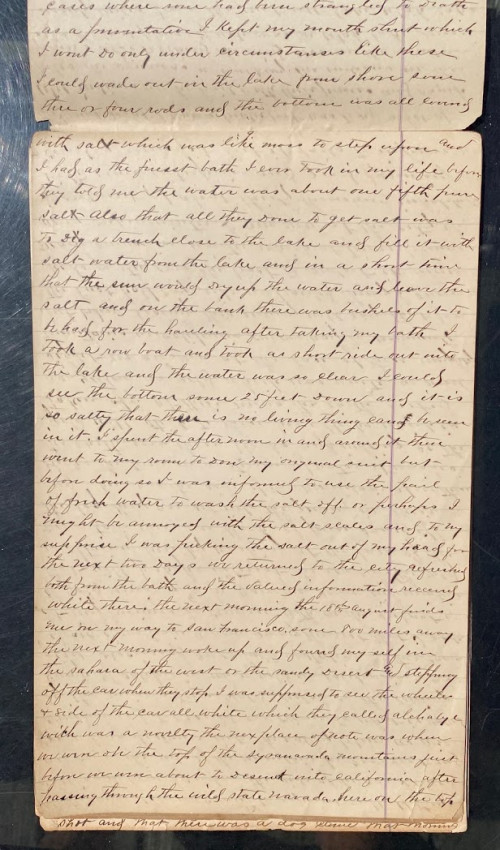 The account starts in Colorado (Boulder, Denver, Colorado Springs, climbing Pike’s Peak [where William has his picture taken (the Stormer group portrait)], Pueblo, Canyon City), Utah (Utah Lake, Salt Lake City [including the new Tabernacle], going for a swim in Salt Lake itself, Fort Hamilton), the Sierra Nevada mountains (or ‘Syranavada’ is William will have it), Nevada, California, (William chats with a gold miner), Sacramento River, Oakland, San Francisco (sight-seeing, trolley cars, the Grand Pacific hotel, Golden Gate Park, the Cliff House), Yosemite (Bridal Vale Falls, Mirror Lake, Cook’s Hotel, Glacier Point, Mariposa Grove), Los Angeles, Pasadena (the ‘Passa Dena valley about six miles from Los Angeles’), Santamonica, sea bathing, visits Charles Sketchley’s Ostrich farm (the first in California) near Anaheim – has a conversation with Sketchley (a man ‘from South Africa’) about the shipping of the birds to California, and his hopes for the business, Los Angeles, back to San Francisco via boat, then headed south for Mexico by ship (the ‘San Blas’, Tunison's ticket included).