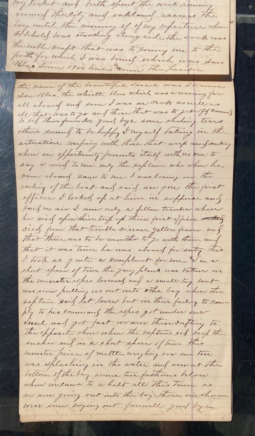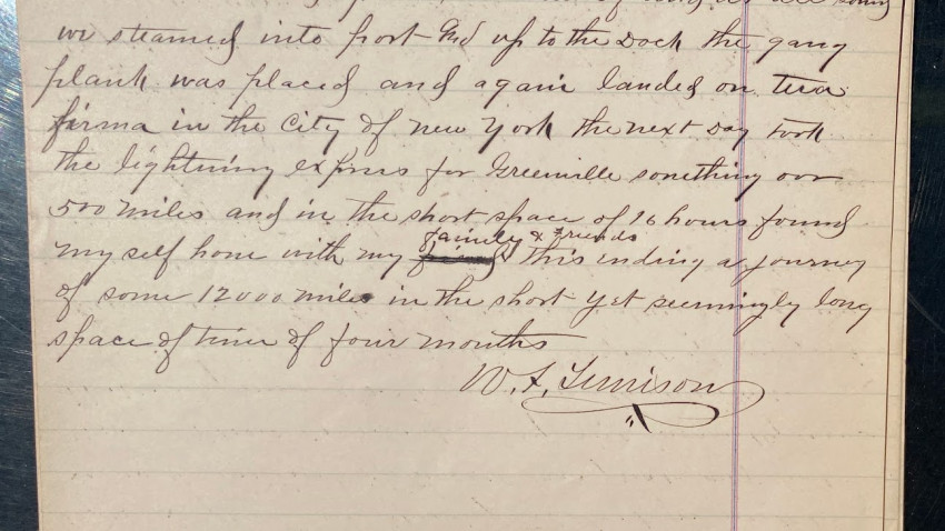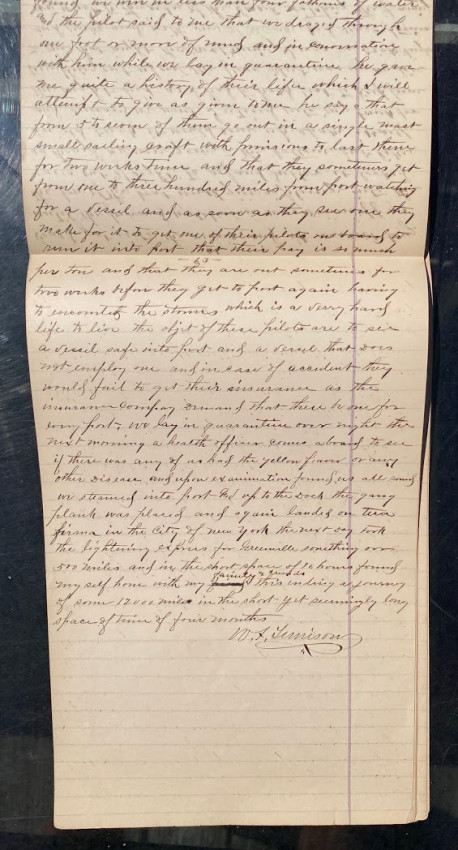 10th November boarded the steam ship for Havana, Cuba, via Progreso (‘progresso’) on the ‘coast of Ucatan’, talks to ‘three old sea captains’ on their way home to Sweden, Germany and England – all having lost their ships (probably for the insurance?). Arrive in Havana, description of places visited. A stormy final leg of the journey from Havana to New York – 30/40 miles from the port of New York a pilot came aboard, yellow fever health check before landing. Landing in New York city ‘the next day took the lightning express from Greenville [Pa.] something over 500 miles and in the short space of 16 hours found myself home with my family & friends’