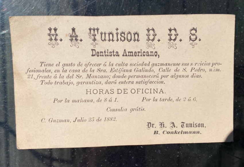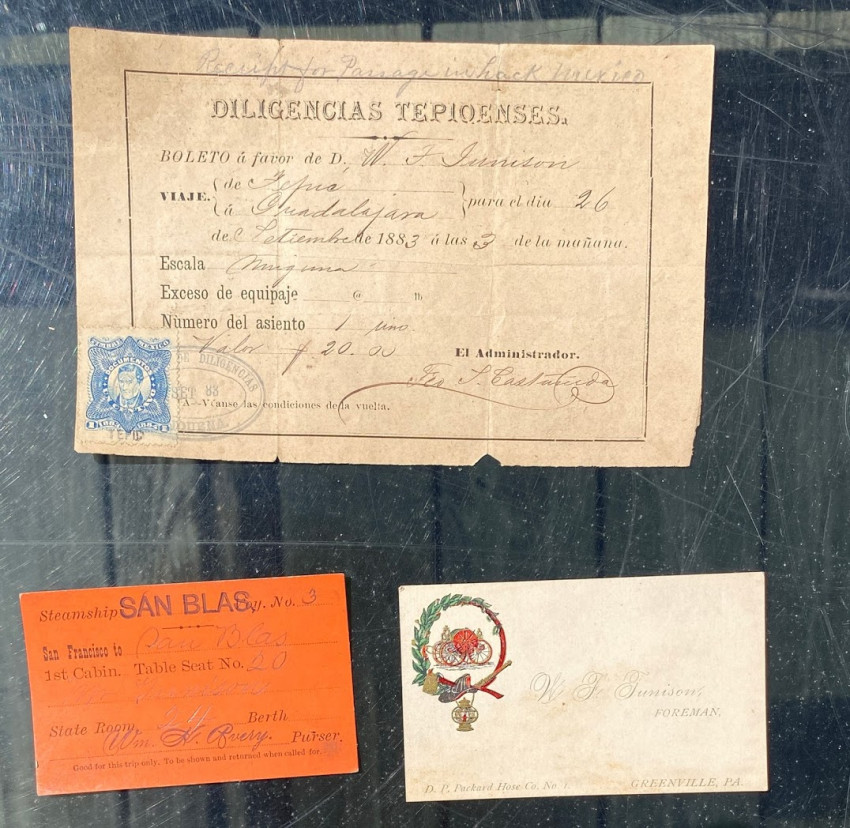 [together with:] some related ephemeral material (7 photographs [3 portraits of W.F. Tunison, 2 of his brother Hiram; a damaged cabinet view of the exterior of the Tunison’s family store in New York City; and a group portrait taken on top of Pike’s Peak on 11th August 1883 by H.W. Stormer of Manitou]; with Stormer’s business card, the verso signed by 11 of individuals in the group portrait; Tunison's date-stamped ticket for the Steamer ‘San Blas’; brother Hiram’s business card/flyer advertising his services as a ‘Dentista Americano’; a stamped receipt given to W.F. Tunison for payment for a trip on the ‘Diligencias Tepiqenses’, dated 26 September 1883, from Tepia to Guadalajara; a later bill of exchange made out to Hiram A. Tunison, but signed over by him to his brother William; a ‘business’ for W.F. Tunison in his capacity as a fireman: foreman of ‘D.P. Packard Hose Co. No. I.’)