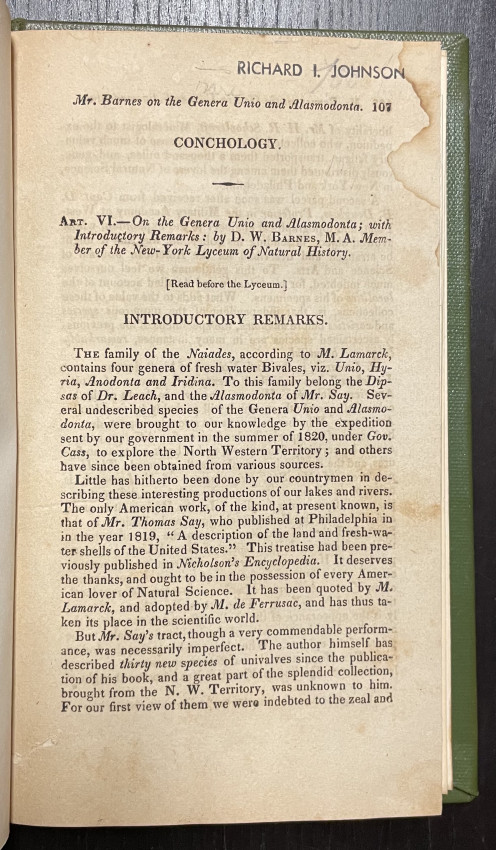 Richard I. Johnson's copy of a defective but rare example of early American Conchology, published in Benjamin Silliman's American Journal of Science, Vol. 6, 1822.