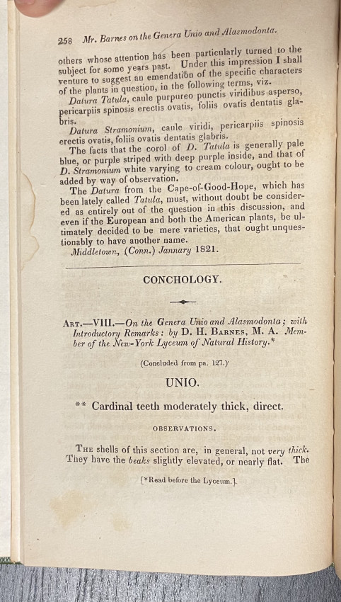 D.W. Barnes. On the Genera Unio and Alasmodonta , with introductory remarks. Published in 2 parts, with illustrations. The present volume contains the two parts removed from the original volume, pp . 107-127; 258-280; along with a photocopy of an 1827 article by Barnes.