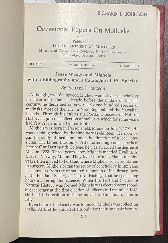 - Johnson, Richard L. Jesse Wedgwood Mighels with a bibliography and a catalogue of his species. -- Occasional Papers on Mollusks, v. 1(no. 14): 213-231.