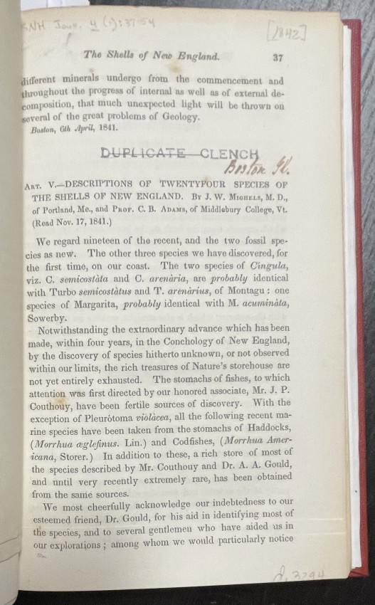 - __ __. Descriptions of Six Species of Shells Regarded as New...[Extracted from the Boston Journal of Natural History, for April,1843]. Pp. [1]-6, with 1 plate (number 16)-- Description of Astarte Portlandica, Plate XVI, Fig. 2. This is the separately published issue repaged 1-6.] (OCLC 3 copies.) See The Maine Naturalist of the Knox Academy for reference.